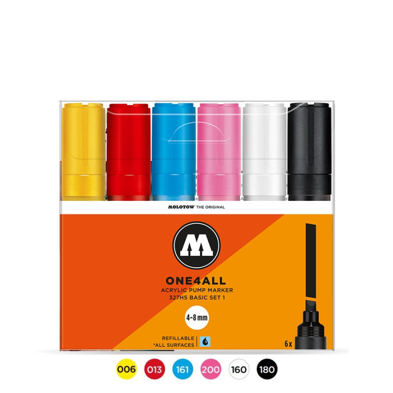 Komplektas - 6 vnt. Akrilo pagrindu. Linija - 4-8 mm. Pusiau blizgus. Labai neskaidrūs. Kapiliaru sistema. Labai greitai džiūsta. Skiedžiami vandeniu arba acetono. Tinka beveik visiems paviršiams.. Užpildymas min 50 k. Vidaus ir lauko naudojimui. Keičiamos galiukas. Pagaminta Vokietijoje