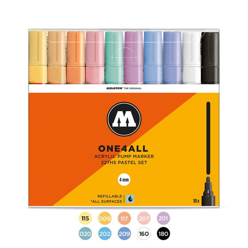 Komplektas - 10 vnt. Akrilo pagrindu. Linija - 4 mm. Pusiau blizgus. Labai neskaidrūs. Kapiliaru sistema. Labai greitai džiūsta. Skiedžiami vandeniu arba acetono. Tinka beveik visiems paviršiams.. Užpildymas min 50 k. Vidaus ir lauko naudojimui. Keičiamos galiukas. Pagaminta Vokietijoje