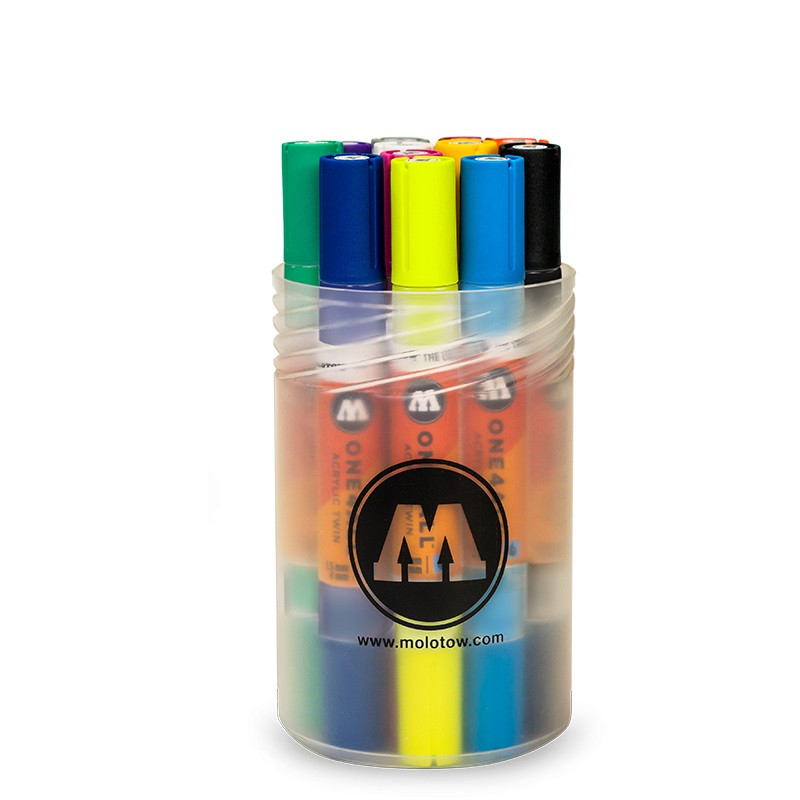 Komplektas - 12 vnt. Akrilo pagrindu. Linija - 1.5/4 mm. Pusiau blizgus. Labai neskaidrūs. Kapiliaru sistema. Labai greitai džiūsta. Skiedžiami vandeniu arba acetono. Tinka beveik visiems paviršiams.. Užpildymas min 50 k. Vidaus ir lauko naudojimui. Keičiamos galiukas. Pagaminta Vokietijoje